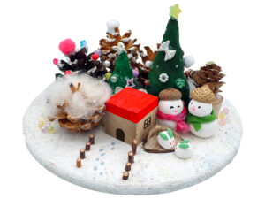 ・松ぼっくりやどんぐりなどの自然の素材を使い、冬の森をイメージしたオブジェを作ります。