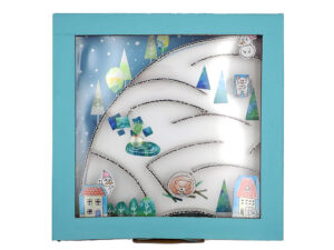 ・ダンボールを使って迷路を作ります。雪をイメージした風景を迷路の背景に描きます。イラストや文字などを描き、ゲームらしさを出します。