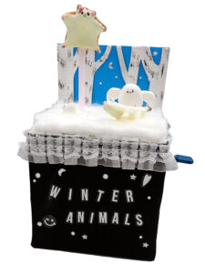 ・箱の中の変形させた針金を回すと、連動して箱の上のモチーフが動く「クランク構造」を利用した制作物です。